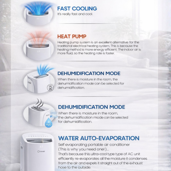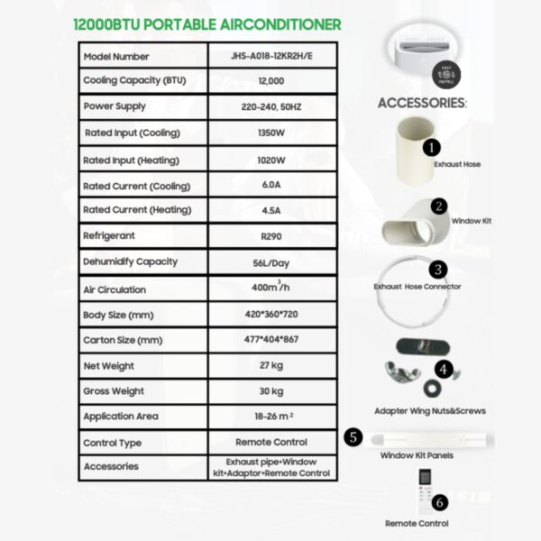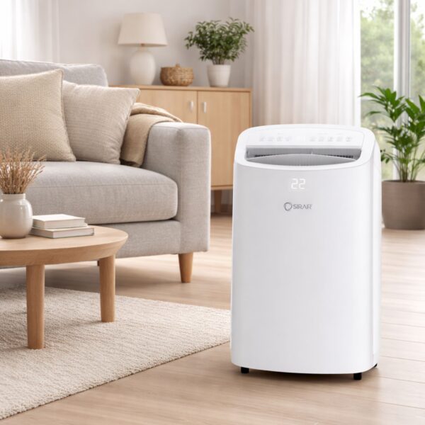 The Sirair Brezza Fresca 12000BTU Portable Air Conditioner is the ultimate mobile climate control solution – perfect for homes, apartments, offices, and small commercial spaces. With fast cooling, heat pump functionality, dehumidifier mode, and WiFi smart control, this feature-packed unit gives you true year-round comfort in a compact, movable design.