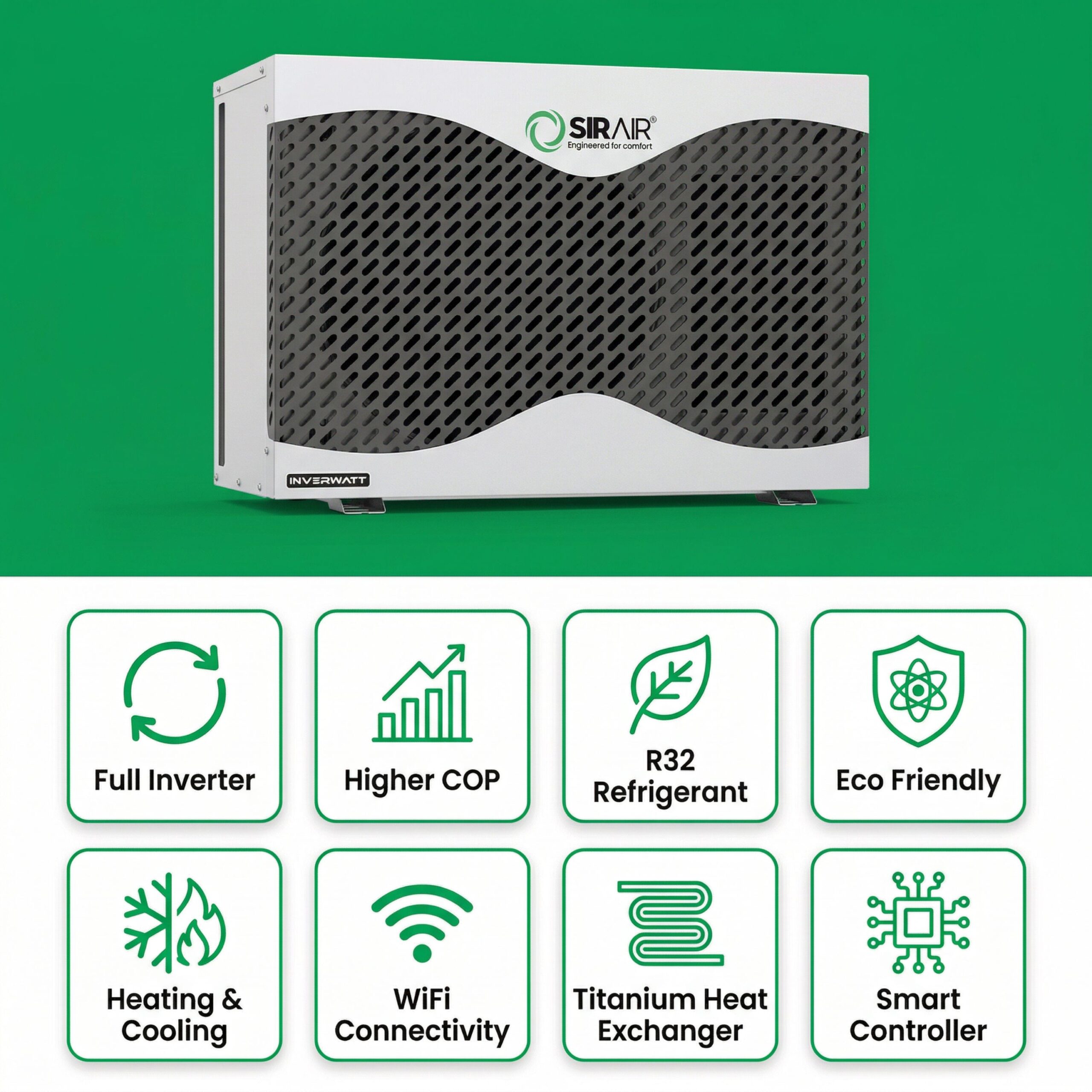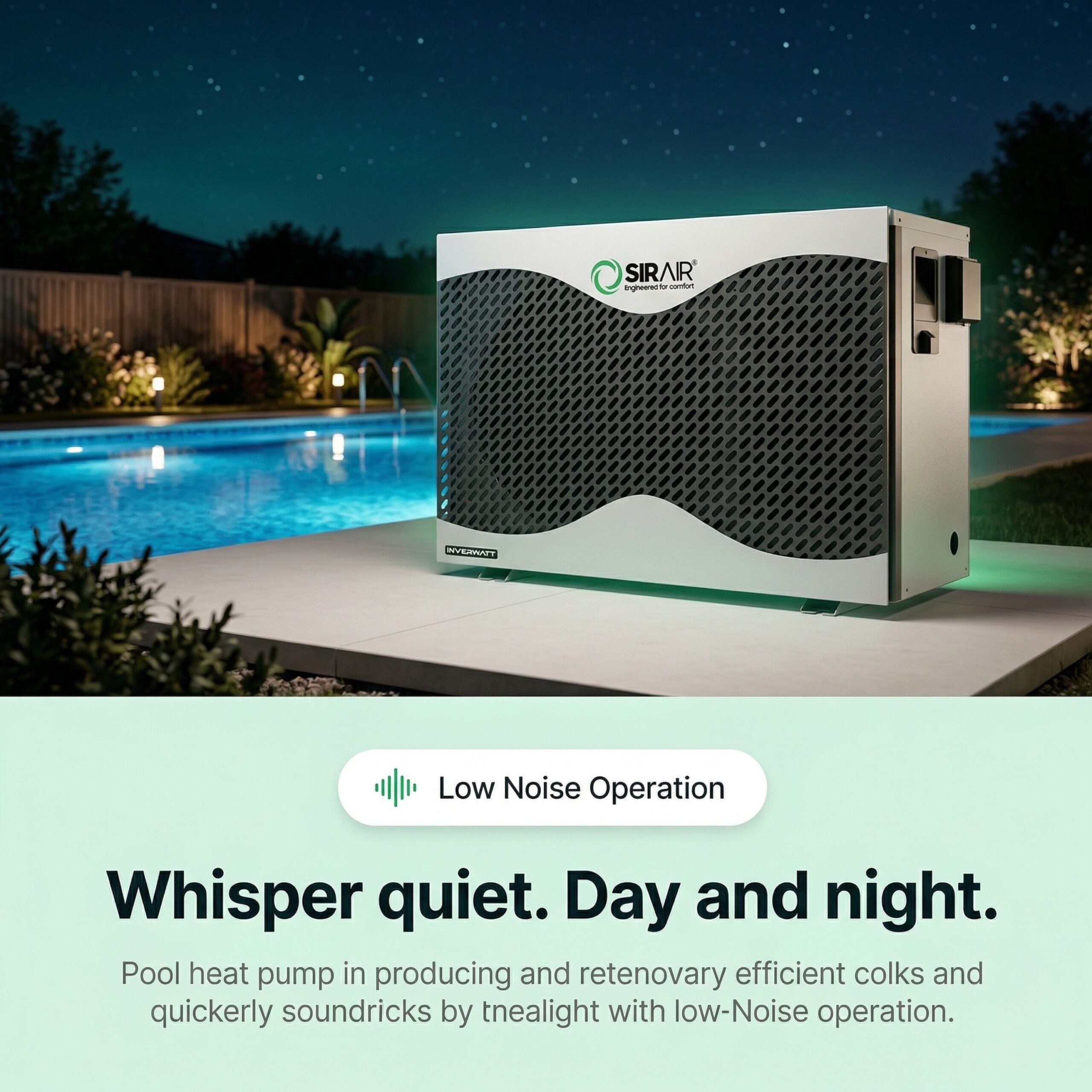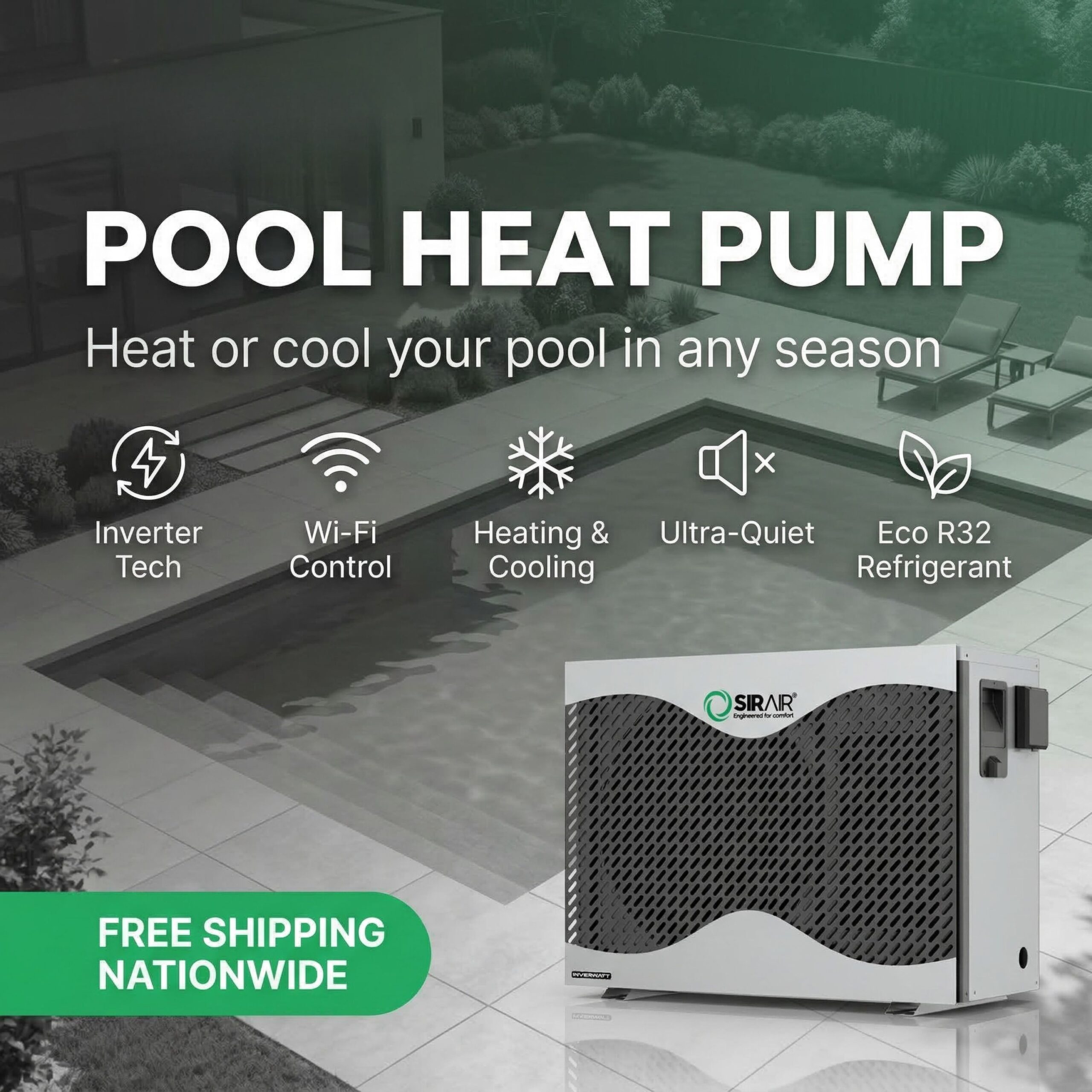 Enjoy perfect pool temperatures year-round with the Sirair Inverwatt 17.1kW Pool Heat Pump, a powerful, energy-saving heating solution that combines inverter technology, smart Wi-Fi control, and ultra-quiet operation. Designed for medium to large residential pools, this heat pump intelligently adjusts its output to match your pool’s real-time heating demands—saving you energy and money with every cycle. Thanks to its inverter compressor, the Inverwatt operates silently and efficiently, maintaining your desired water temperature with whisper-quiet performance. With eco-conscious construction, smart connectivity, and weather-resistant durability, the 17.1kW Inverwatt is the smart choice for eco-friendly, cost-effective pool heating.