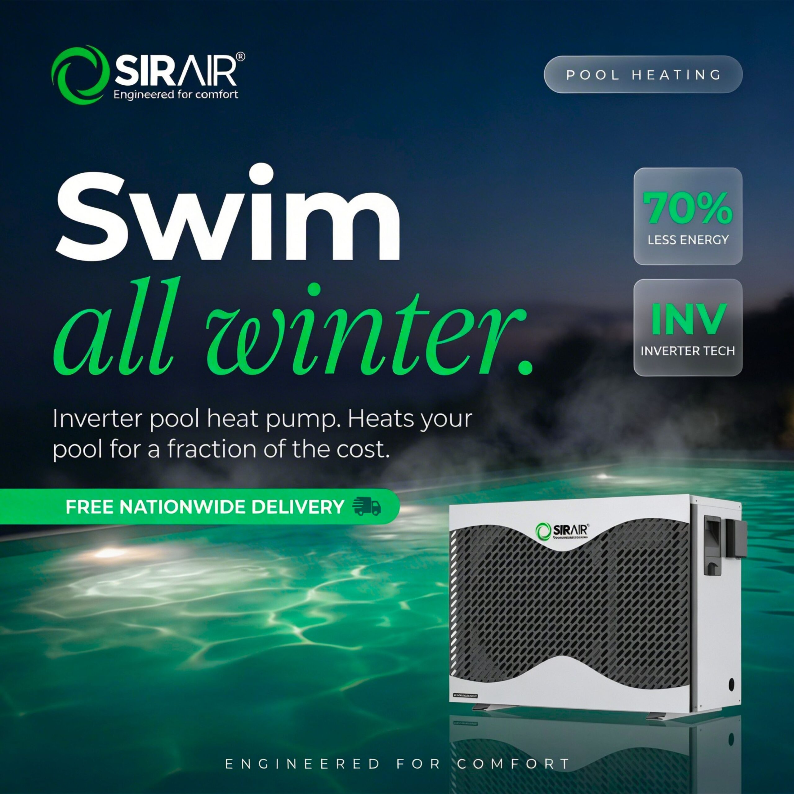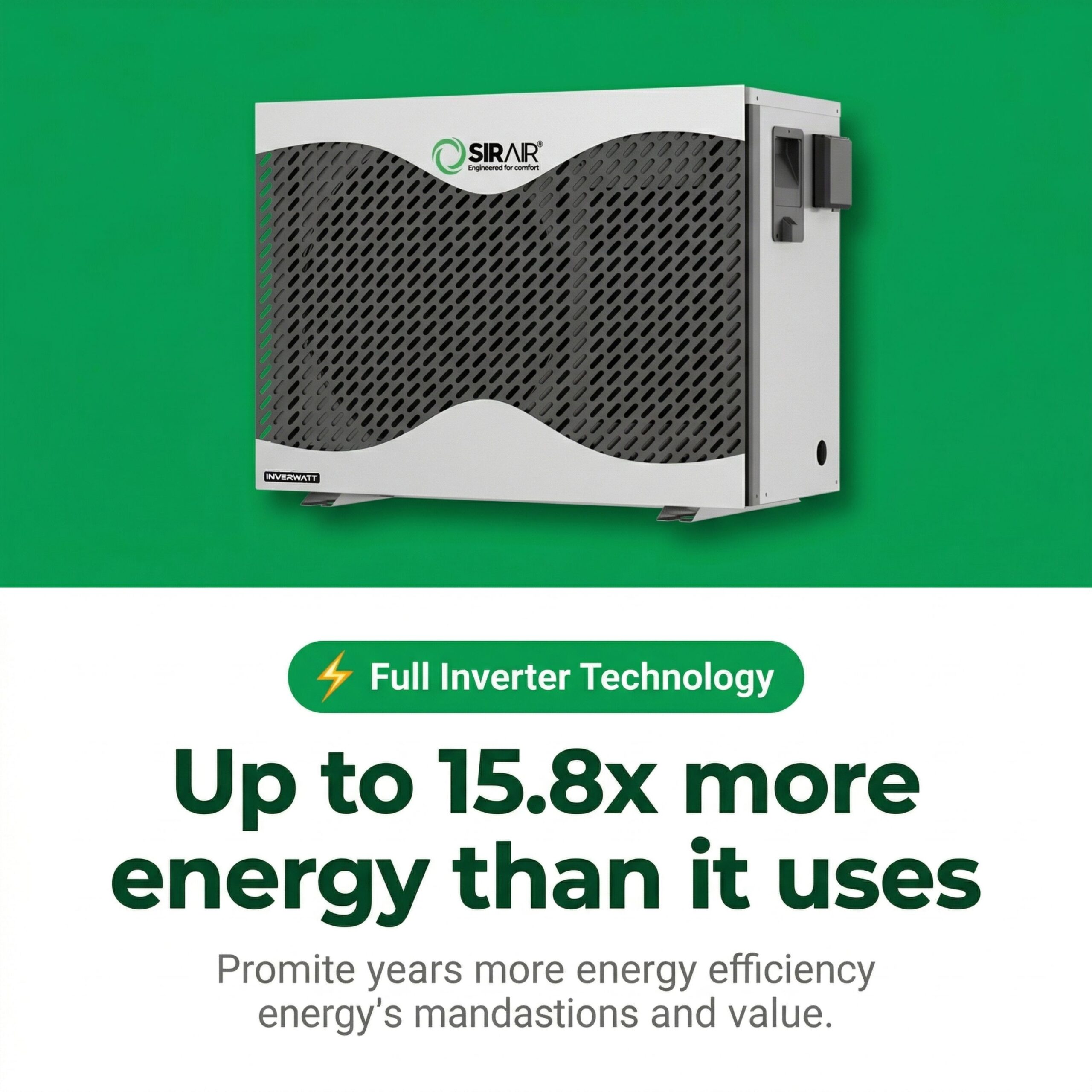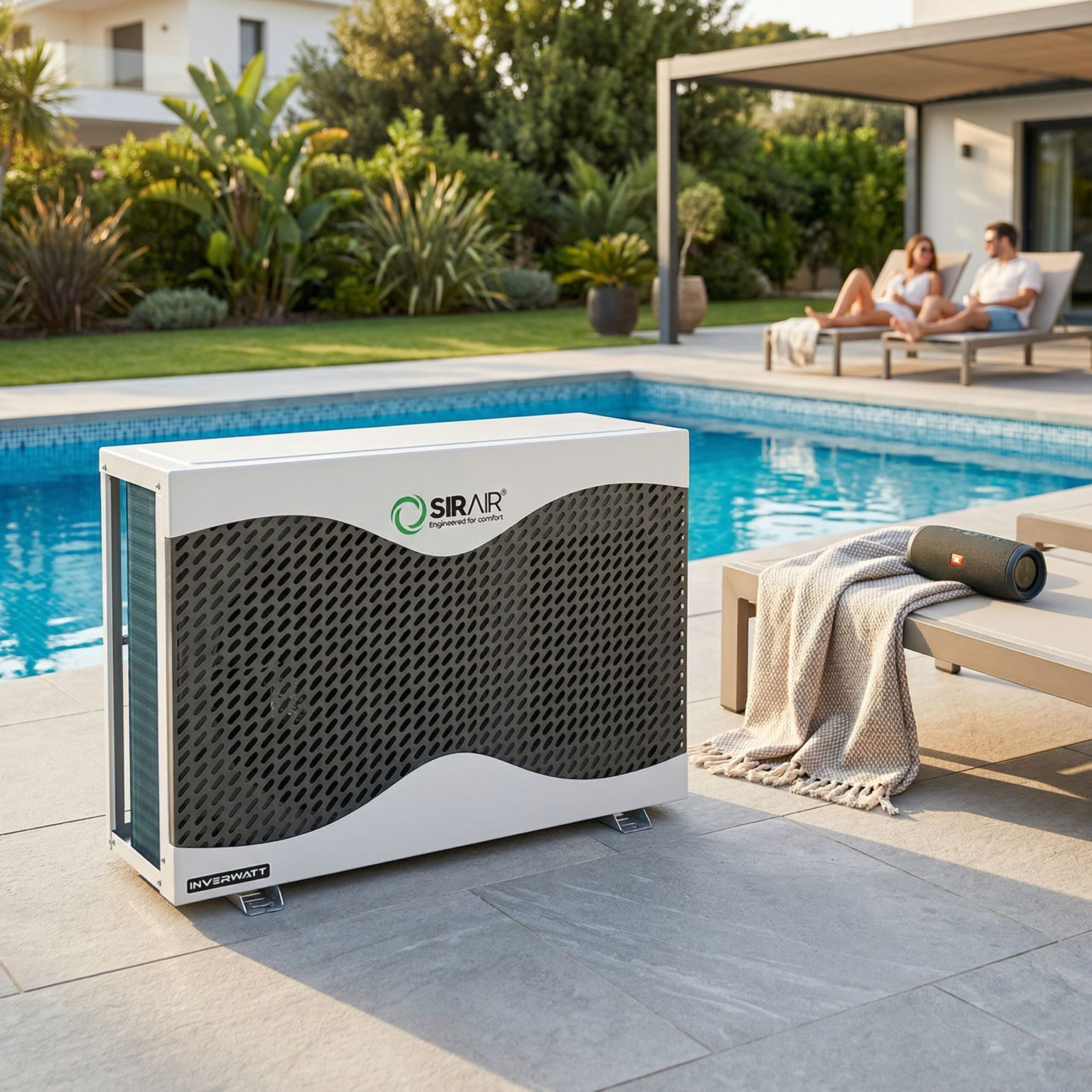 Enjoy perfect pool temperatures year-round with the Sirair Inverwatt 17.1kW Pool Heat Pump, a powerful, energy-saving heating solution that combines inverter technology, smart Wi-Fi control, and ultra-quiet operation. Designed for medium to large residential pools, this heat pump intelligently adjusts its output to match your pool’s real-time heating demands—saving you energy and money with every cycle. Thanks to its inverter compressor, the Inverwatt operates silently and efficiently, maintaining your desired water temperature with whisper-quiet performance. With eco-conscious construction, smart connectivity, and weather-resistant durability, the 17.1kW Inverwatt is the smart choice for eco-friendly, cost-effective pool heating.